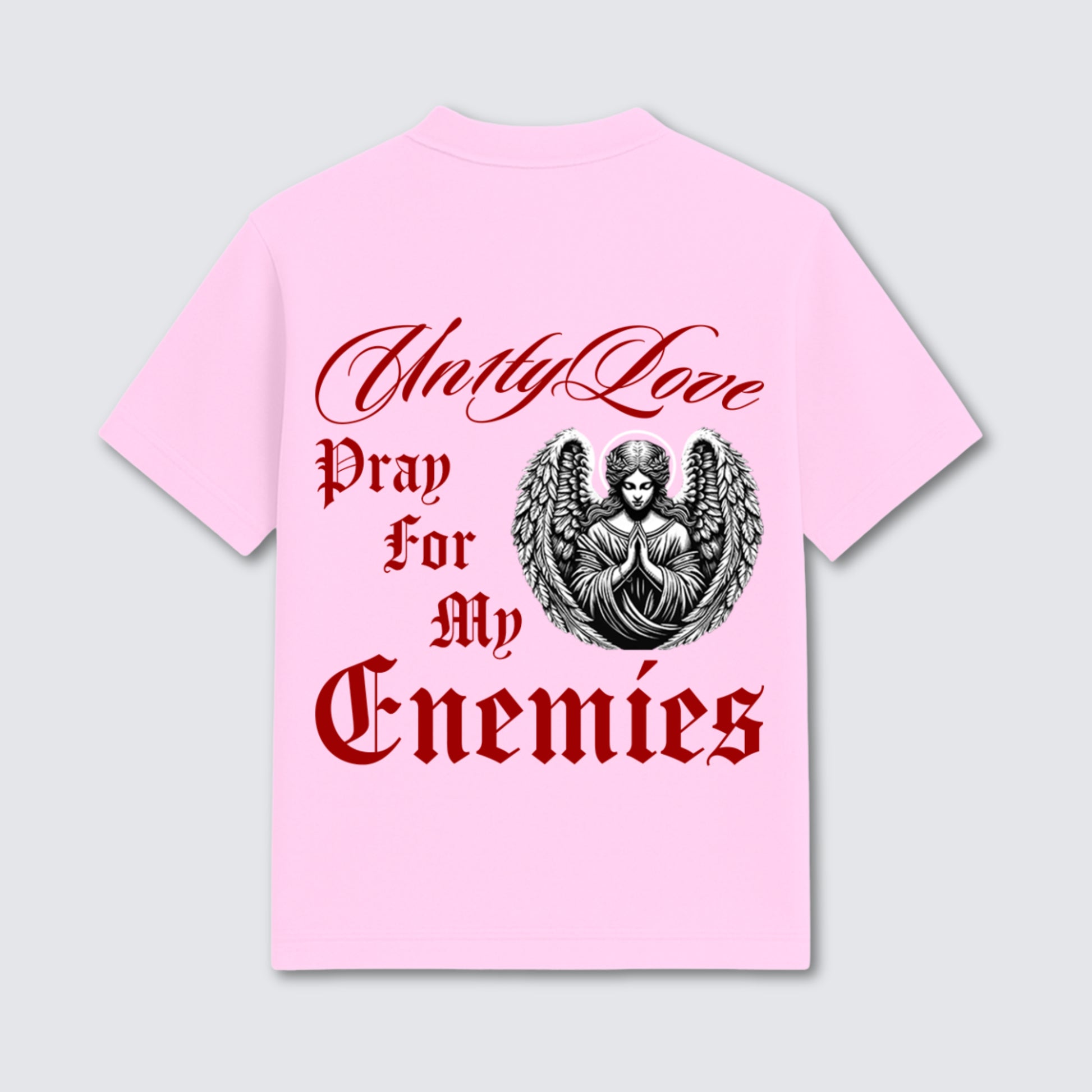 Classic-fit garment-dyed drop-shoulder T-shirt in rose. Ribbed neckline with angel graphic printed on the front left chest. Back features oversized angel graphic paired with “Pray for My Enemies” text. Balanced construction with a clean finish.