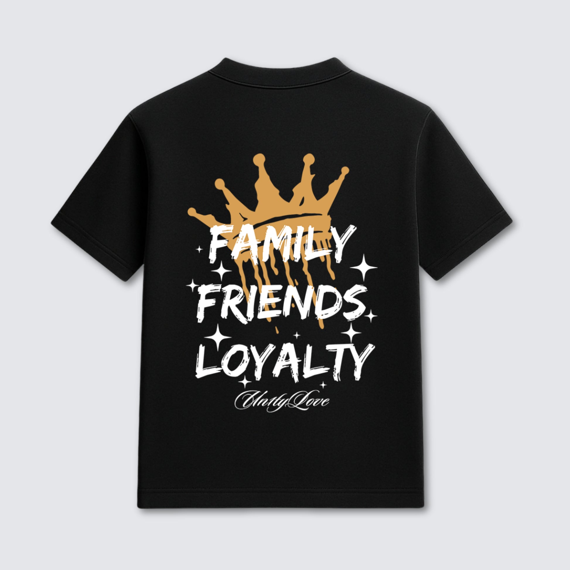 Custom-fit garment-dyed drop-shoulder T-shirt in black. Ribbed neckline with dripping crown graphic printed on the front left chest. Back features oversized crown with “Family Friends Loyalty” text. Balanced construction with a clean finish.