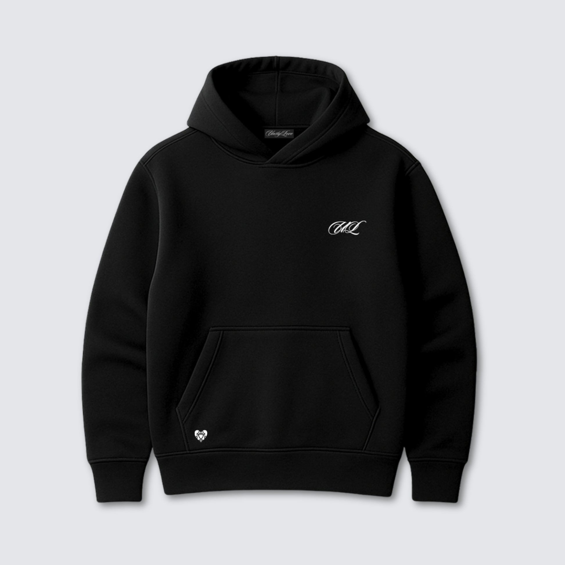 Custom-fit heavyweight drop-shoulder hoodie in black. Spacious hood and ribbed trims with signature UL emblem printed on the front left chest. Back features full Un1tyLove™ logo paired with outlined heart emblem. Balanced construction with clean, structured finish.